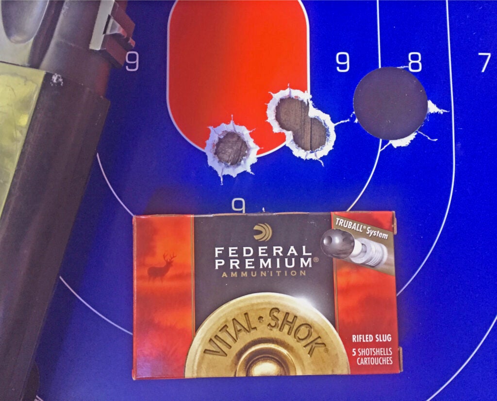 Skeet shooting aside, the M1 Super 90 Defense excels at what it was designed for. It delivered impressive accuracy at 25 yards with Federal’s TruBall 1-ounce slugs. It put three in a 1-inch cluster on a paper target. That black paster you see above and to the right of the slugs on the target above was used to cover the hole made by the wads. I also shot Sellier and Bellot’s 12-pellet 00 Buck Max. It was effective at the same yardage, placing 10 of the pellets inside a 12- by 18-inch silhouette target.